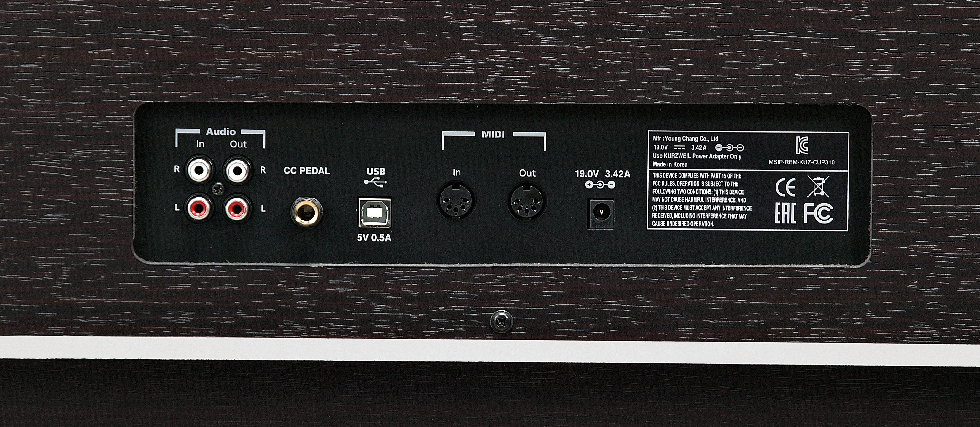 Коммутационные возможности представлены линейными стереофоническими входом и выходом на разъемах RCA. Есть отдельный вход AUX для внешнего источника звука на разъеме 1/8'' Jack TRS. Эффективным занятиям в ночное время суток способствуют 2 выхода для наушников, сделанных на разъемах 1/4'' Jack TRS. Порт USB-B дает возможность подключения к компьютеру и обмена MIDI-данными. Встроенная акустическая система имеет 4 динамика и общую выходную мощность 50 Вт. Энергообеспечение устройства осуществляется от комплектного адаптера на 19 V DC. Присутствует настраиваемая функция отключения питания для экономии энергоресурсов. Комплектация включает банкетку для пианиста.