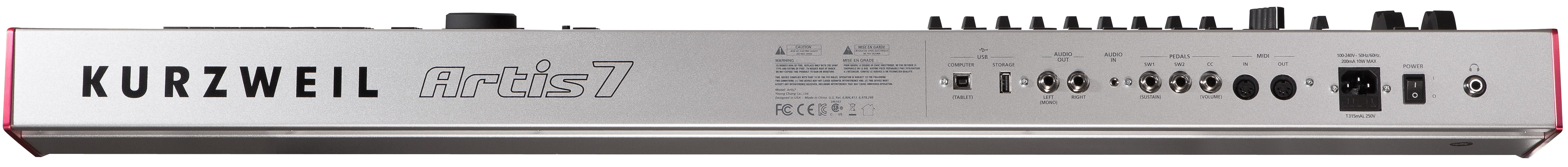 Клавиатура Kurzweil Artis 7 может быть разделена на 4 зоны с назначаемыми MIDI-контроллерами, уровнями громкости, включая отдельное управление отключением звука (Mute). Есть аналоговые выходы на балансных разъемах TRS и один вход mini-Jack на передней панели для подключения MP3-плеера или иного источника записанного звука.