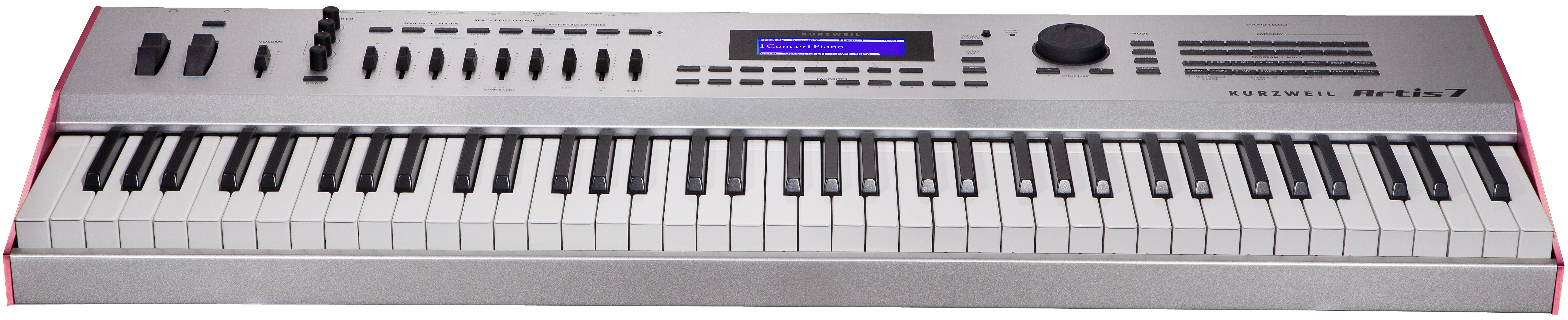 Коллекция звуков Kurzweil Artis 7 очень богата, и представлена классическими звуками из коллекций Kurzweil PC3K с платой расширения KORE 64, а также сэмплами фортепиано высокого качества, винтажных электропиано, классических клавинетов и синтезаторов, гитар, перкуссионных и других инструментов. Фортепианная часть представлена в том числе и 32-мя программами Grand Piano, а органная – эмуляторами классических органов Hammond, Vox и Farfisa, выполненными по фирменной технологии KB3 ToneReal, включая 9 реалистичных органных регистров. Всего же банков – 256, у инструмента есть полифония на 128 голосов, а также возможность создать 256 пользовательских тембров и столько же комбинаций. Предустановлено 256 мультитрековых шаблонов, и есть возможность добавить до 256 пользовательских, в каждом из которых назначается до 4 независимых зон.