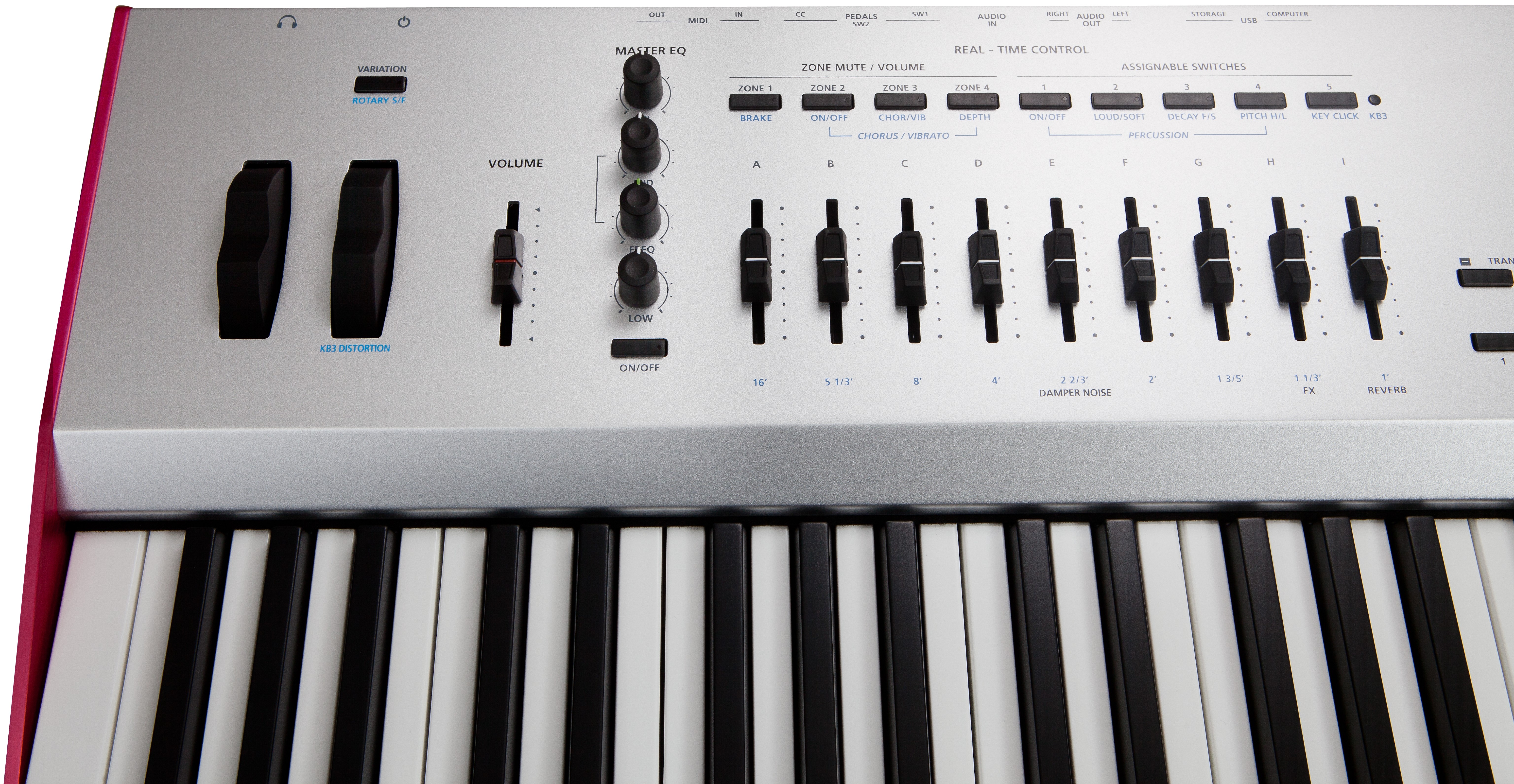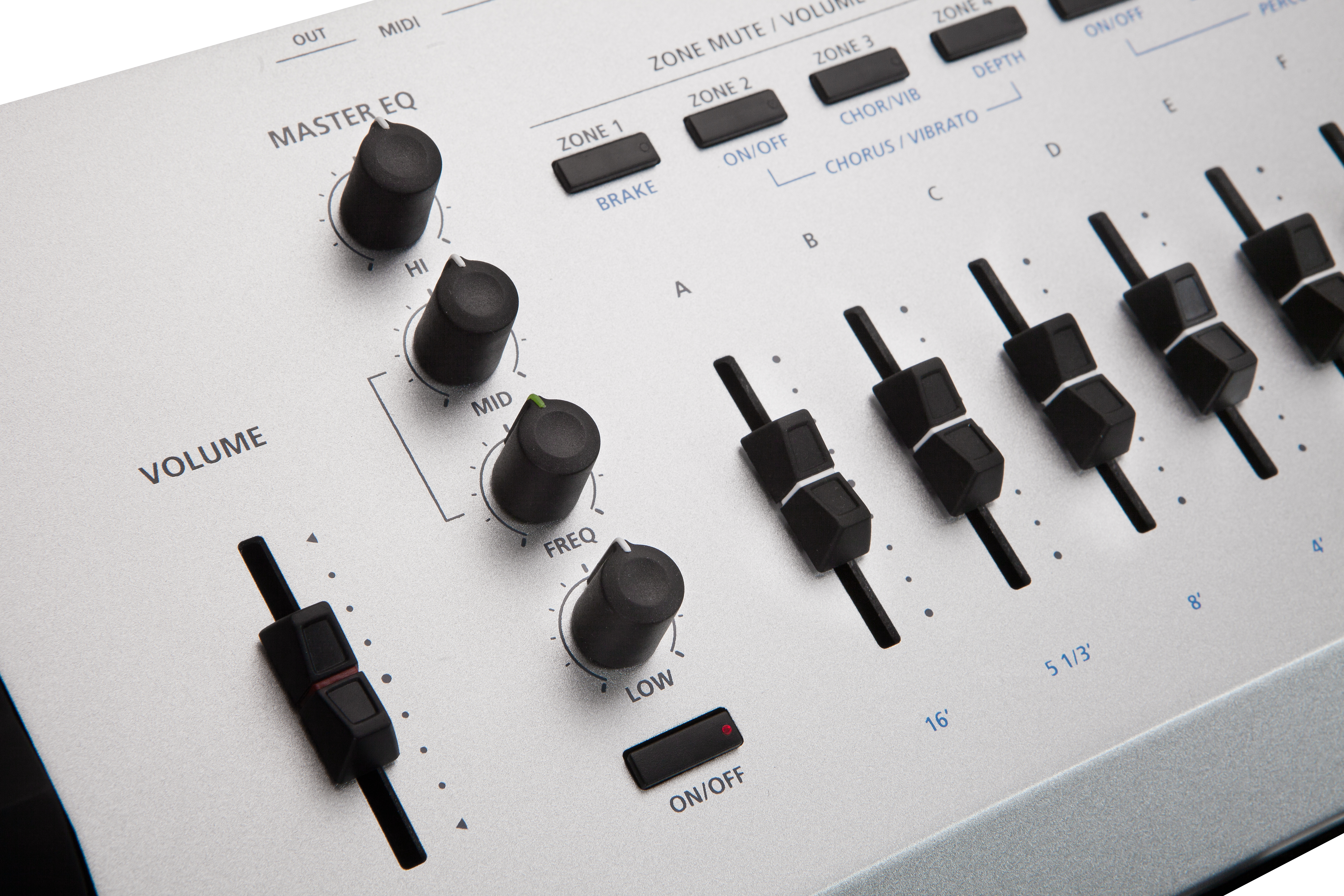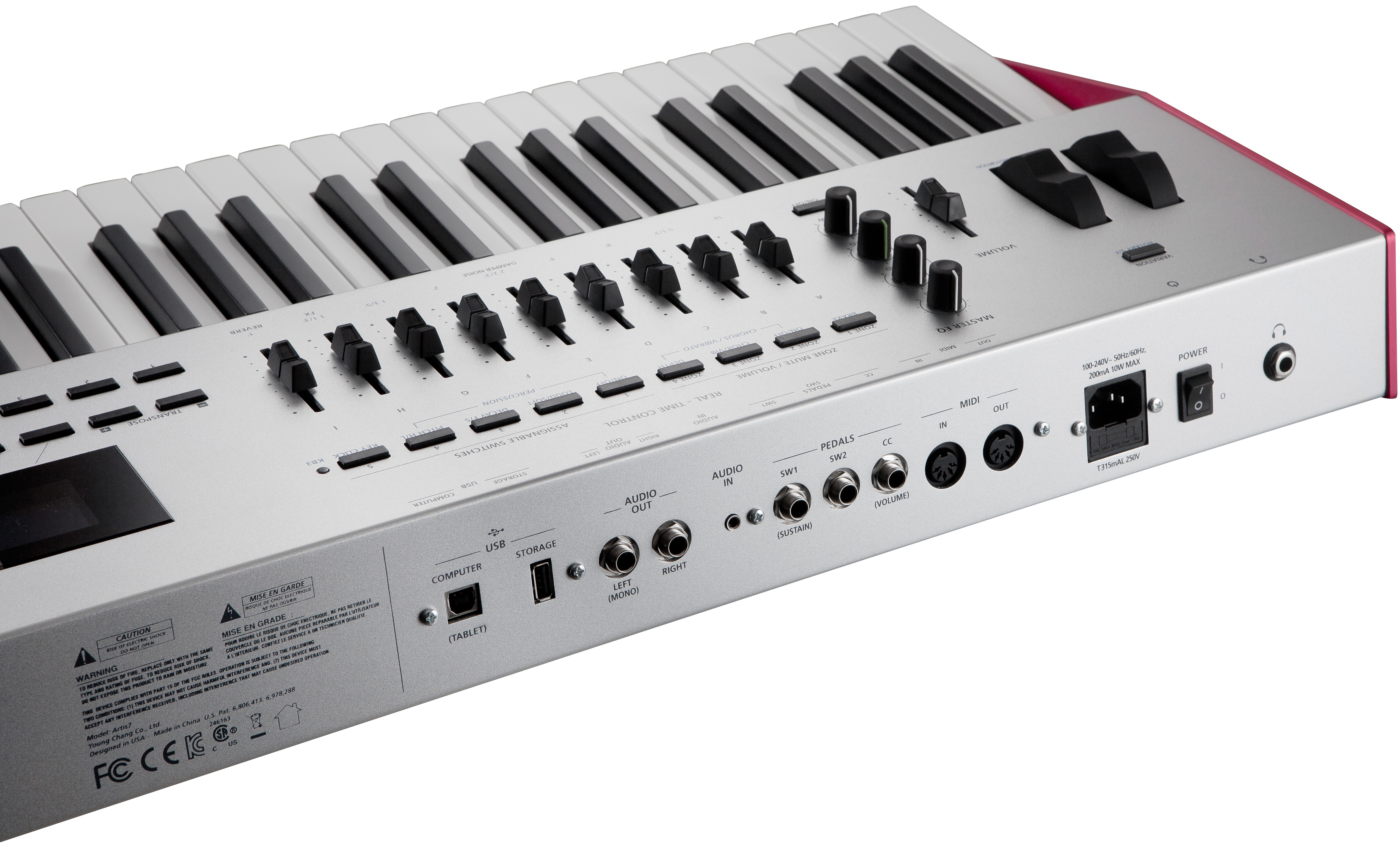 Управление синтезатором осуществляется в том числе и с помощью программируемых контроллеров в количестве 22 штук: это 9 слайдеров, 6 переключателей, 2 колеса (модуляции и высоты тона) и 3 входа для педалей. В комплекте к инструменту идет и свитч-педаль, то есть музыканту не придется приобретать ее дополнительно. Контроллеры транспонирования также находятся на передней панели для быстрого и легкого доступа. Рядом можно найти 10 назначаемых кнопок для быстрого доступа к самым востребованным сэмплам и банкам, кнопки быстрого доступа к категориям и программам с сохранением собственных пресетов, а также трехполосный эквалайзер, управляемый поворотными ручками.
