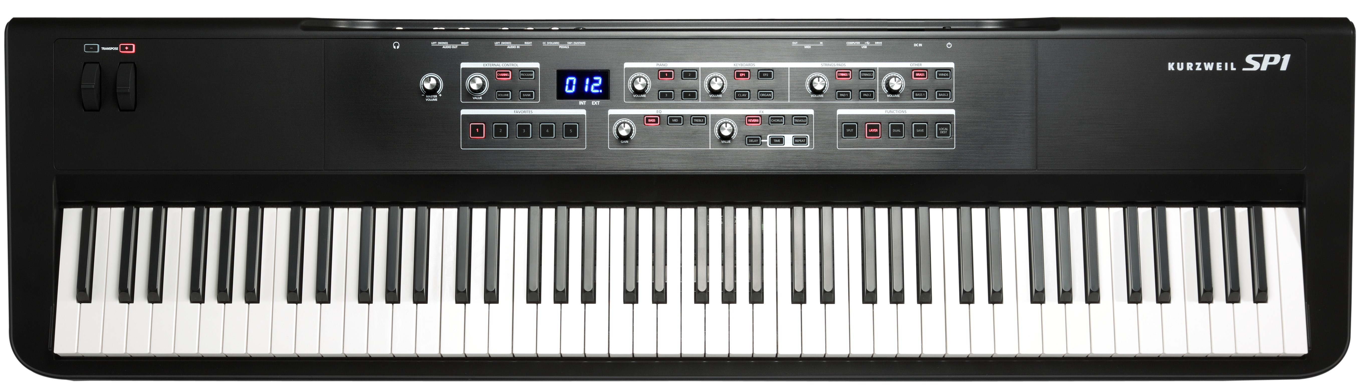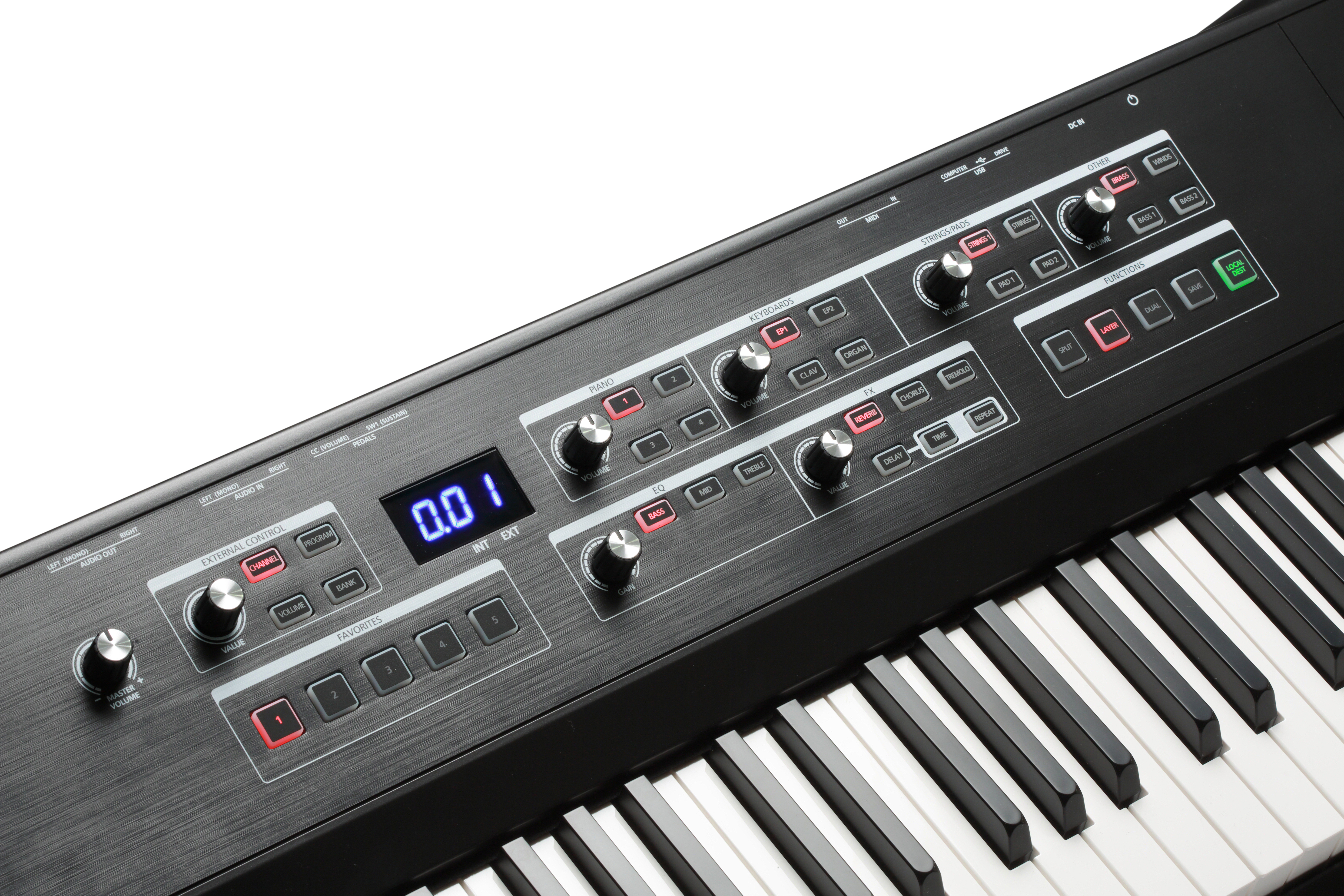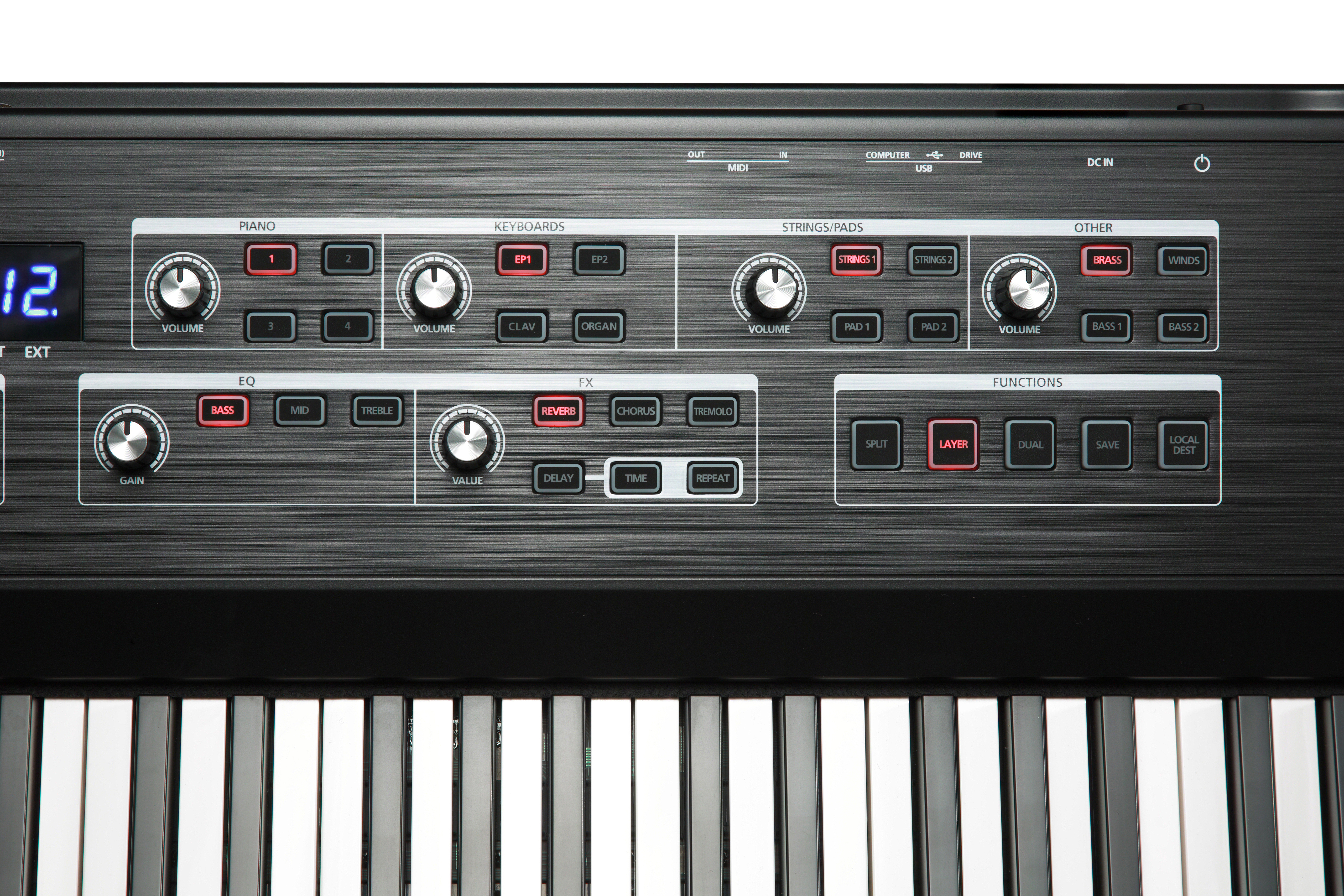 Полученные настройки можно сохранить в виде 5 пресетов. Присутствуют режимы Layer для наложения тембров, Split для разделения клавиатуры на несколько равных зон, а также режим Dual, позволяющий играть в 4 руки с преподавателем. В верхнем левом углу лицевой панели располагаются 2 колеса для управления высотой тона и модуляцией, а также клавиши для транспортирования. Значения изменяемых параметров отображаются на ЖК-дисплее, а все кнопки имеют встроенную подсветку, позволяющую комфортно работать с инструментом даже в условиях плохого освещения.