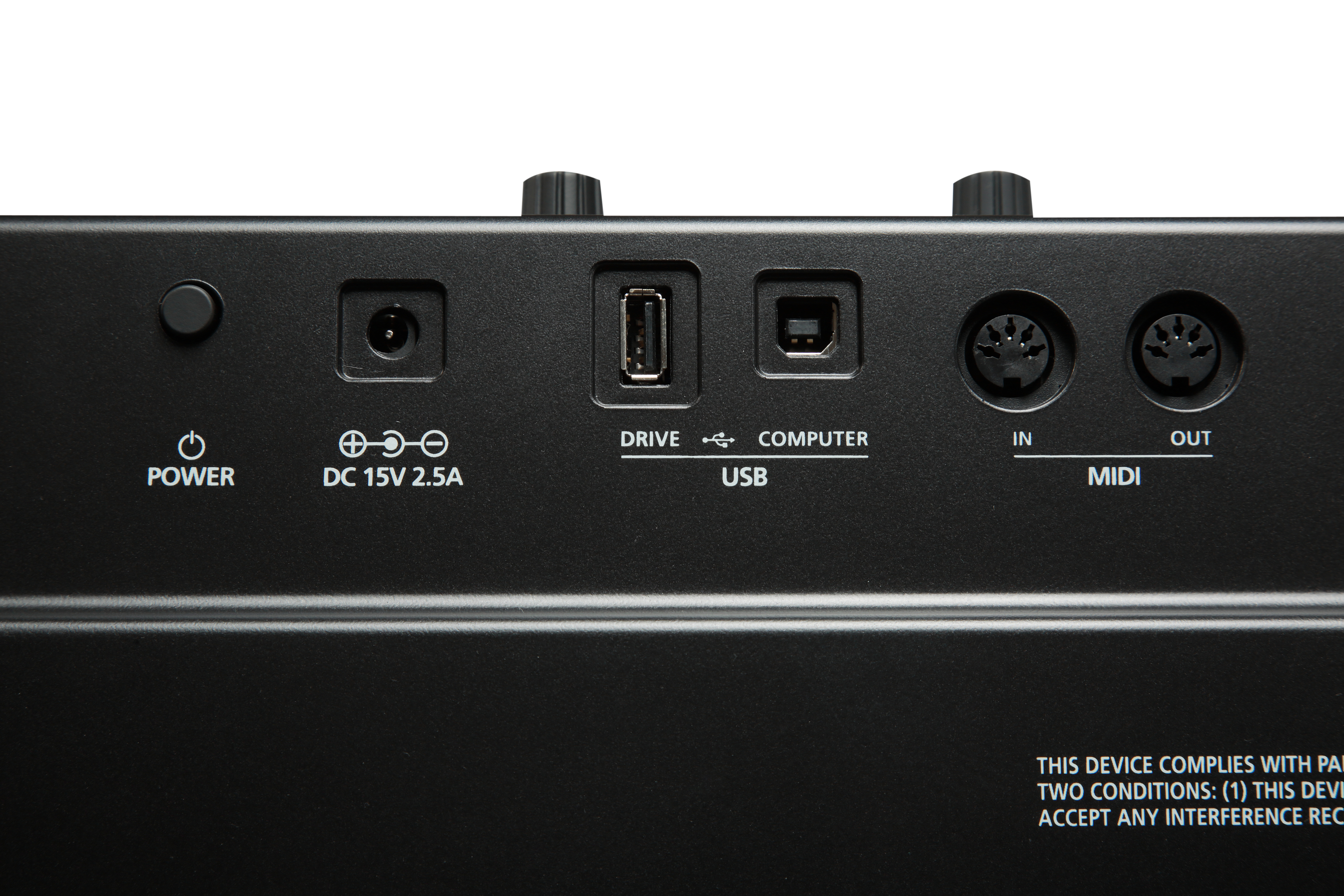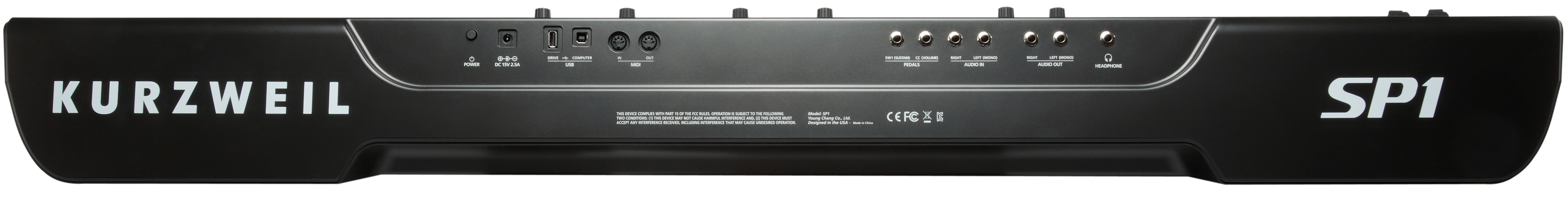 Коммутационные возможности представлены стереофоническими входом и выходом на парах разъемов 1/4'' Jack TS, с помощью которых к пианино можно подключить внешний источник звука и вывести аудиосигнал инструмента на акустическую систему или микшерный пульт. Для внешних педалей экспрессии и сустейна есть 2 входа на разъемах 1/4'' Jack TS. Выход для наушников представлен разъемом 1/4'' Jack TRS. Порт USB-A предназначен для загрузки обновлений, а порт USB-B позволяет подключить пианино к компьютеру для обмена MIDI-данными. Также здесь есть полноценный MIDI-интерфейс с входом и выходом на 5-контактных разъемах DIN. Энергообеспечение осуществляется от комплектного адаптера на 15 V DC. Помимо него в комплекте поставляются педаль сустейна и USB-кабель.