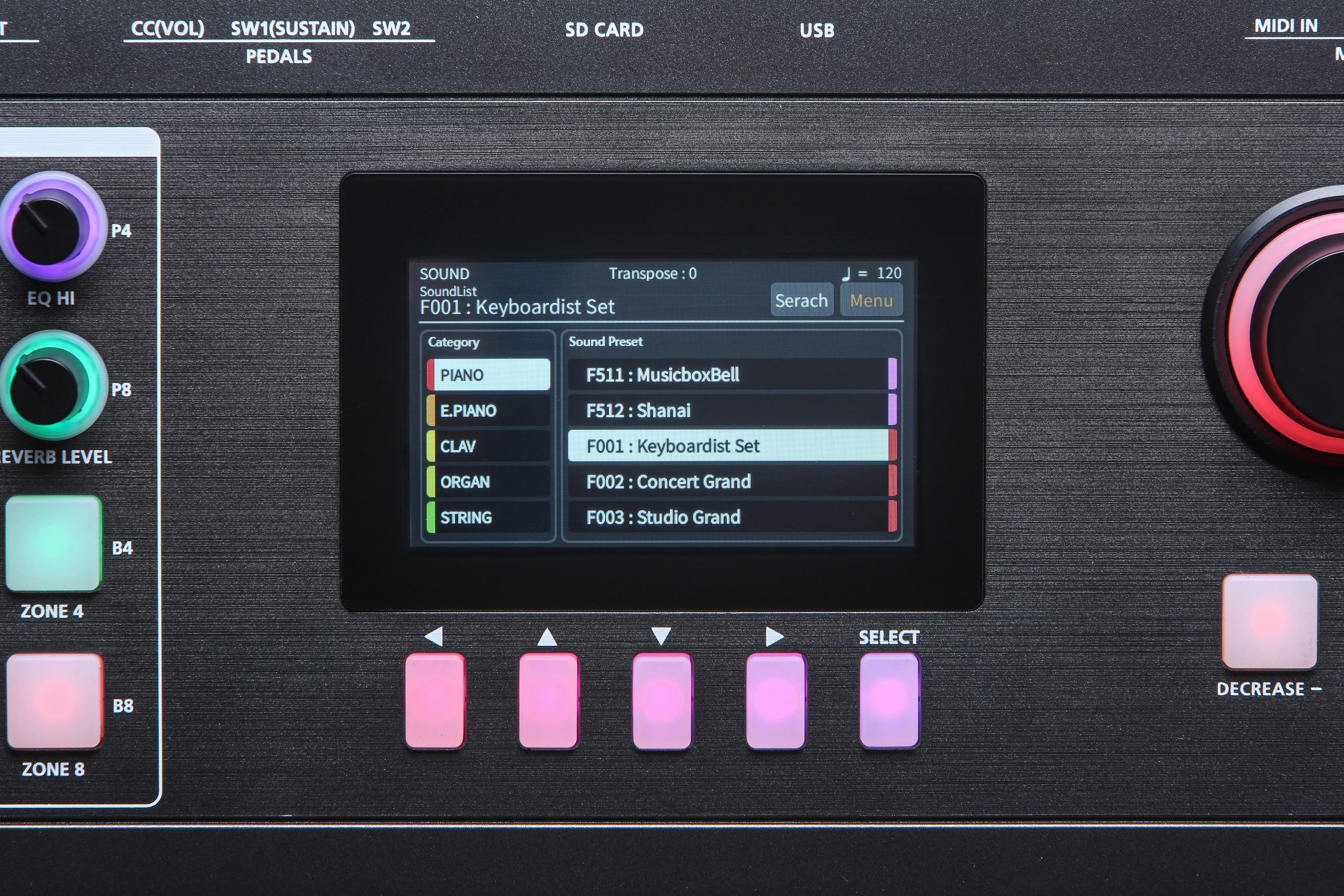 - Authentic Timbre Synthesis Technology (A.T.S.T.): Обновленный тон-генератор A.T.S.T. поддерживает 256-голосную полифонию и предоставляет 512 мульти-пресетов в 13 категориях, включая разнообразные фортепианные, синтезаторные и уникальные альтернативные звуки.