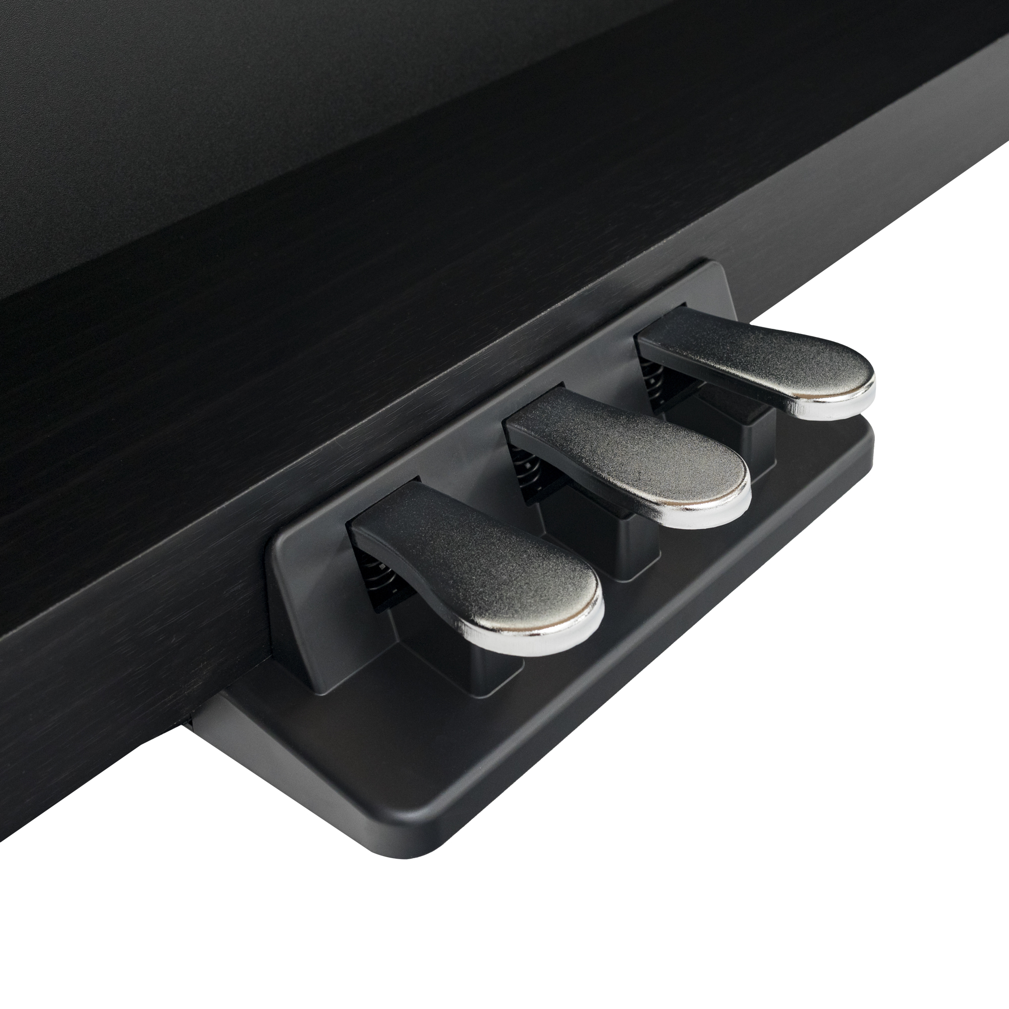 - Блок из трех педалей в комплекте: педальный блок аналогичен акустическому фортепиано. Правая педаль (сустейн) продлевает звук, левая педаль (софт) делает тембр инструмента мягче и тише, а средняя педаль (состенуто) позволяет продлевать только отдельные звуки. Это позволяет почувствовать все возможности музыкального инструмента, что особенно важно для начинающих музыкантов и позволяет сформировать правильные навыки игры.
