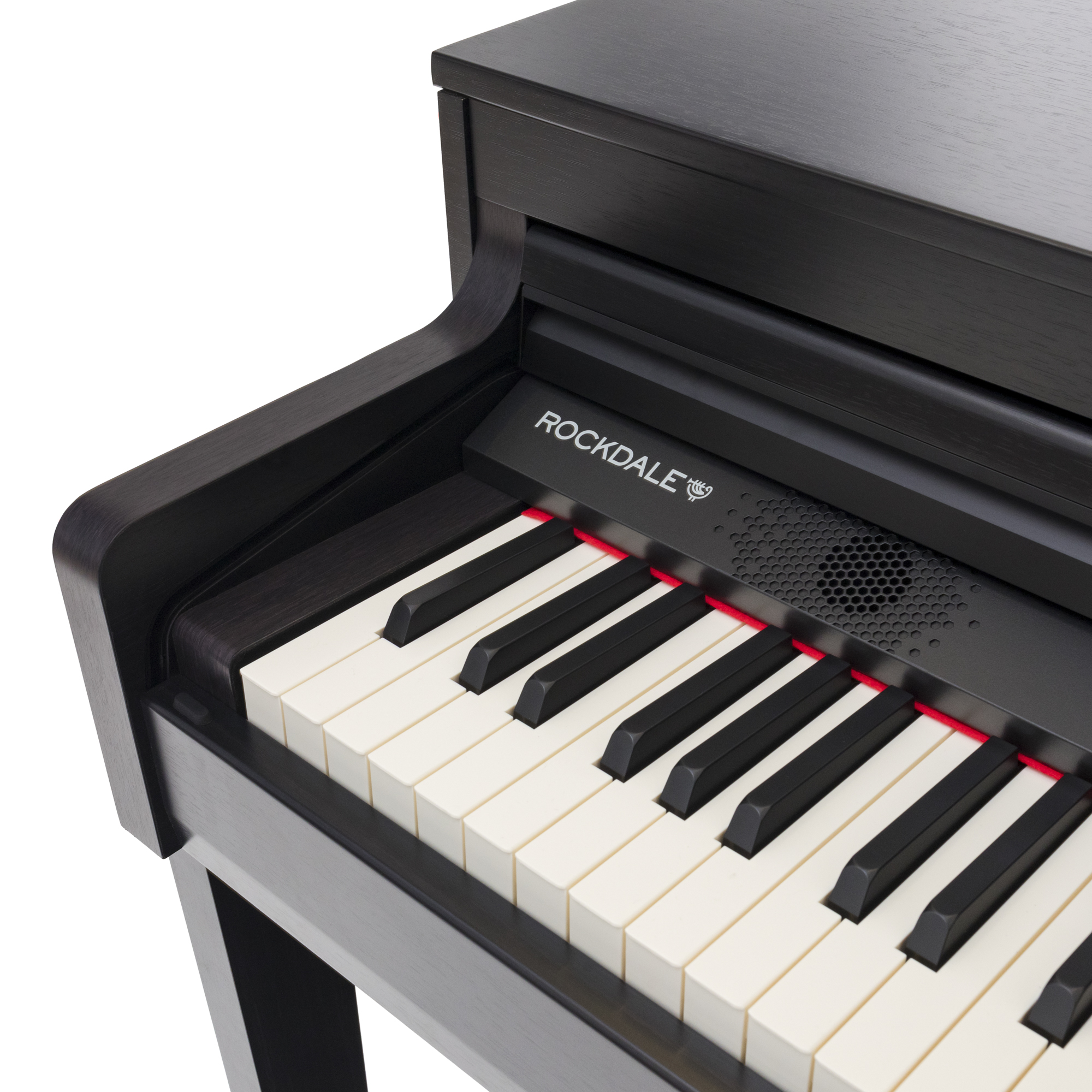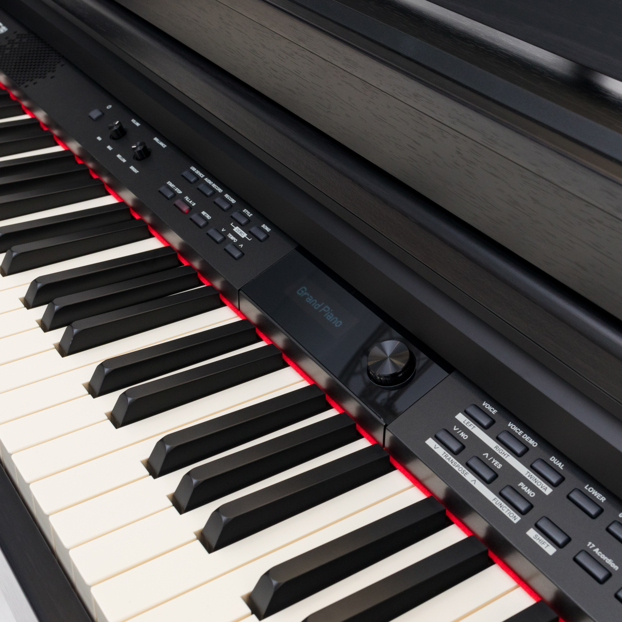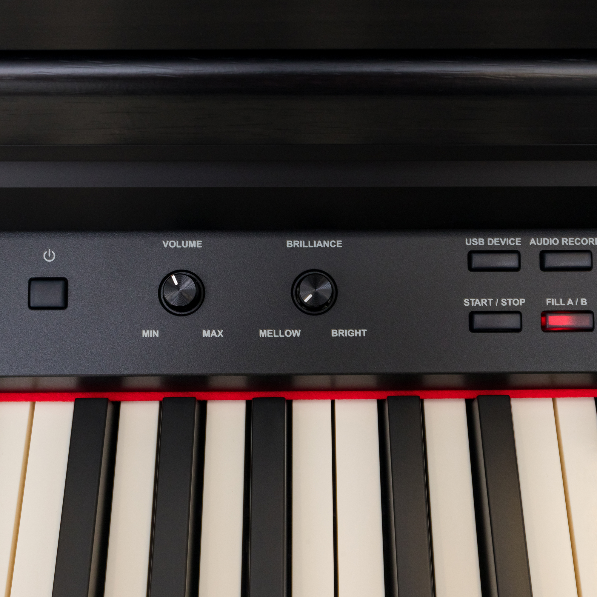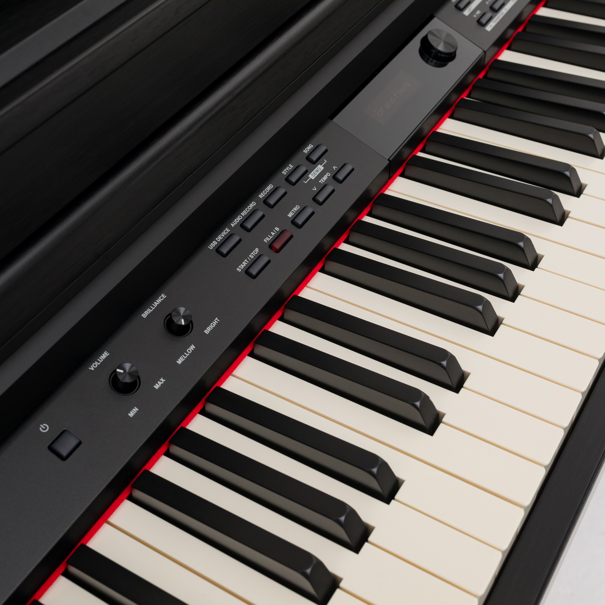 - Полноразмерная градуированная молоточковая клавиатура 88 клавиш: вес клавиши меняется в зависимости от диапазона, аналогично тому, как в акустическом инструменте меняется размер и вес молоточка.