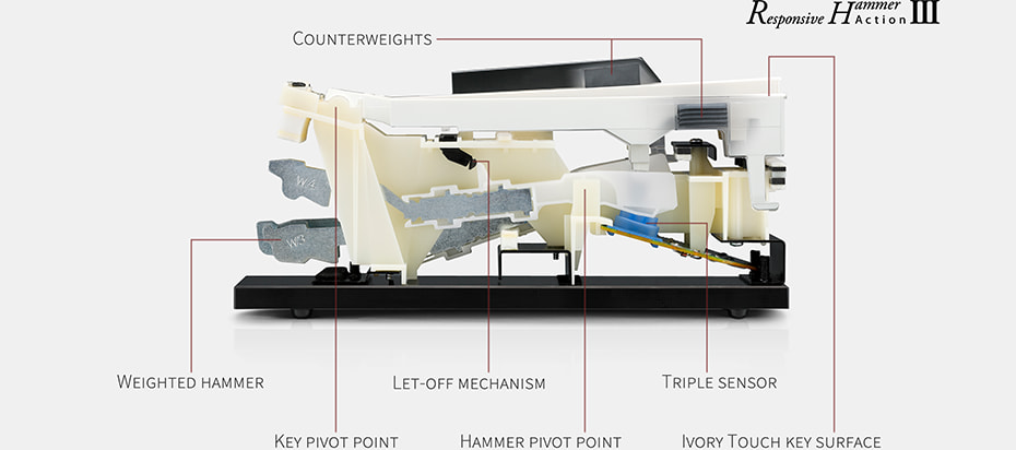 - 88 взвешенных клавиш в стандартном размере с клавиатурой Responsive Hammer III Action, имитирующей игру на акустическом рояле