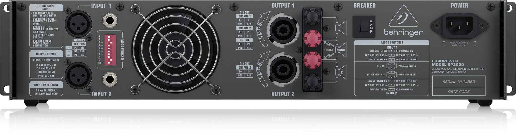 В качестве интерфейсов для подключения источников сигнала в Behringer EUROPOWER EP2000 использованы балансные разъемы XLR и 1/4" TRS Jack, которые переходят в режим моно или моста с помощью рядом с ними находящегося переключателя. Выходные разъёмы представлены интерфейсами типа SPEAKON с блокировкой коннекторов, предупреждающих выдёргивание кабелей, и продублированы зажимами под оголённые провода. Внутри находятся силовые транзисторы Toshiba/Fairchild и тороидальный трансформатор для большей надежности. Весит устройство 15,7 кг и монтируется в рэковую стойку при помощи стальных креплений на корпусе.