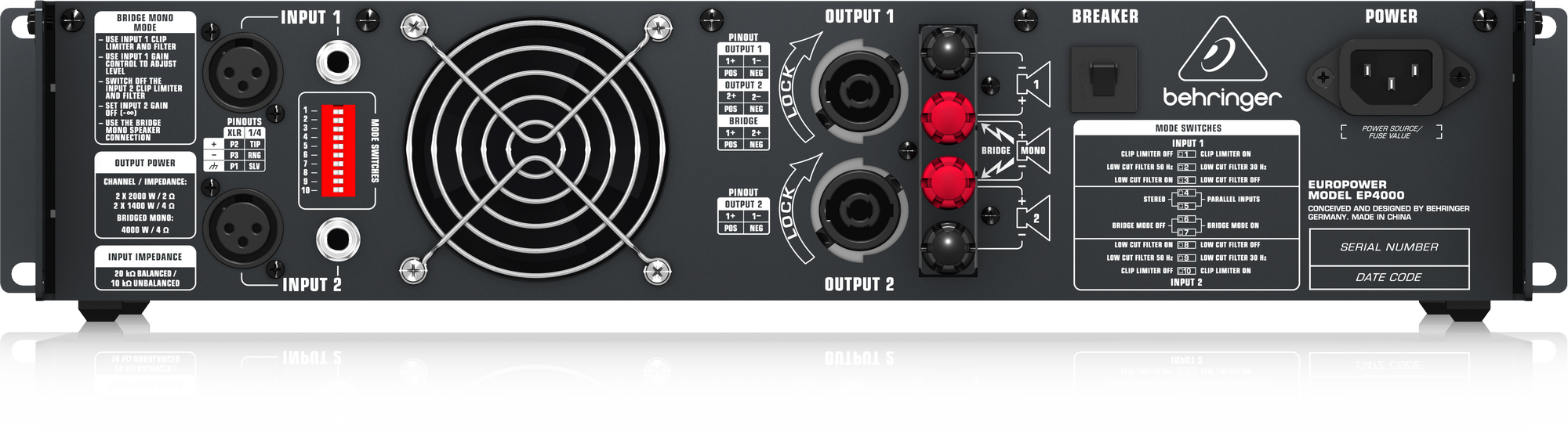 В качестве интерфейсов для подключения источников сигнала в Behringer EUROPOWER EP4000 использованы балансные разъемы XLR и 1/4" TRS Jack, которые переходят в монорежим или режим моста с помощью находящегося рядом с ними переключателя. Выходные разъёмы являются интерфейсами типа SPEAKON с блокировкой коннекторов, предупреждающих выдёргивание кабелей, и продублированы зажимами под оголённые провода. Внутри находятся силовые транзисторы Toshiba/Fairchild и тороидальный трансформатор для большей надежности. Весит устройство 15,7 кг и монтируется в рэковую стойку при помощи стальных креплений на корпусе.
