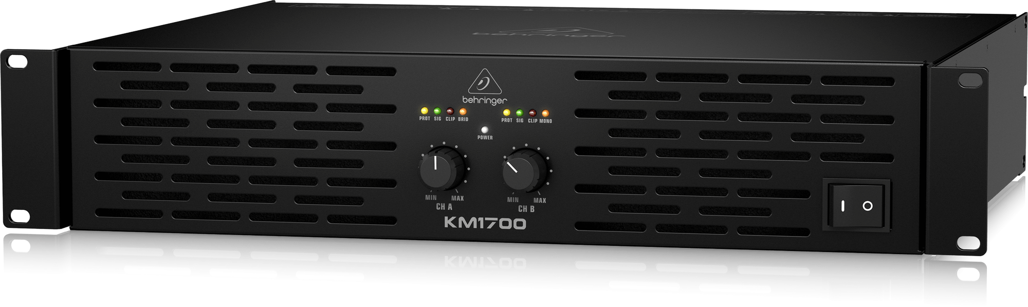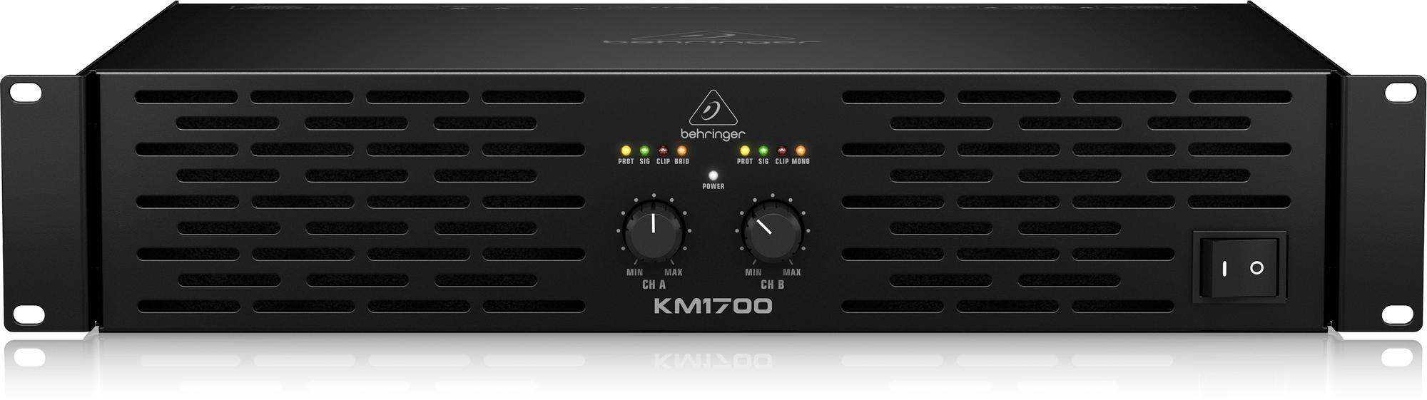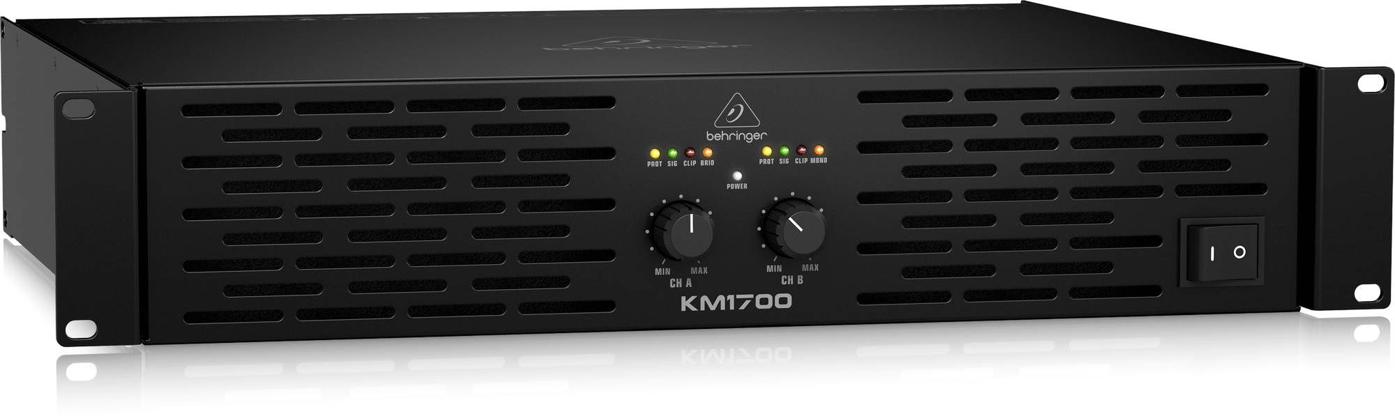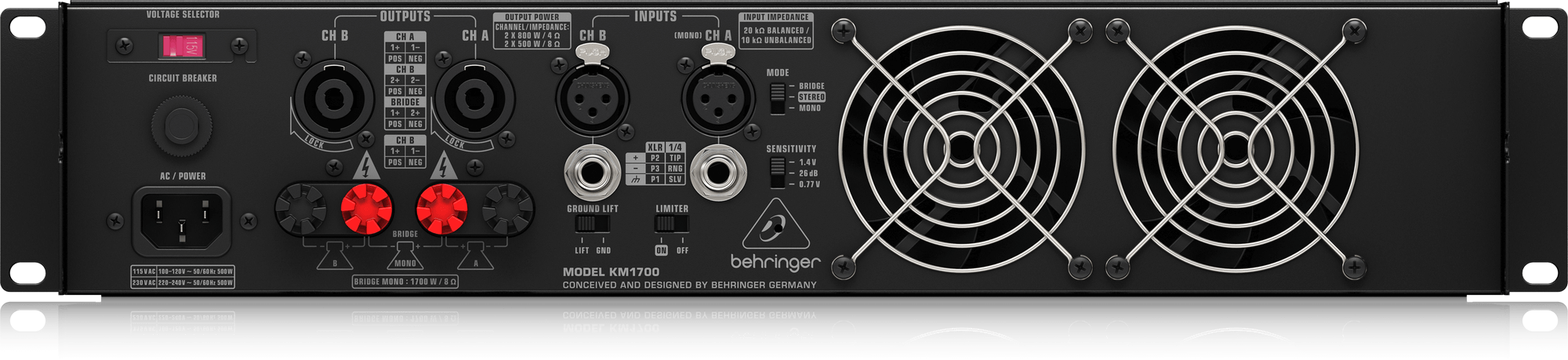 Выходная мощность Behringer KM1700 зависит от нагрузки и может достигать 1700 Вт в мостовом режиме с нагрузкой 8 Ом. Входные подключения производятся с использованием XLR, 6.35 мм TRS Jack (балансные и небалансные подключения), выходы представлены двумя разъемами Neutrik Speakon. Входы и выходы расположены на тыловой панели, где представлены и функциональные переключатели: устранения петли заземления, лимитера, режимов (моно, стерео, мост) и входной чувствительности. Вентиляция в усилителе осуществляется по сквозному принципу: воздух проходит сквозь усилитель от фронтальной до тыловой панели.