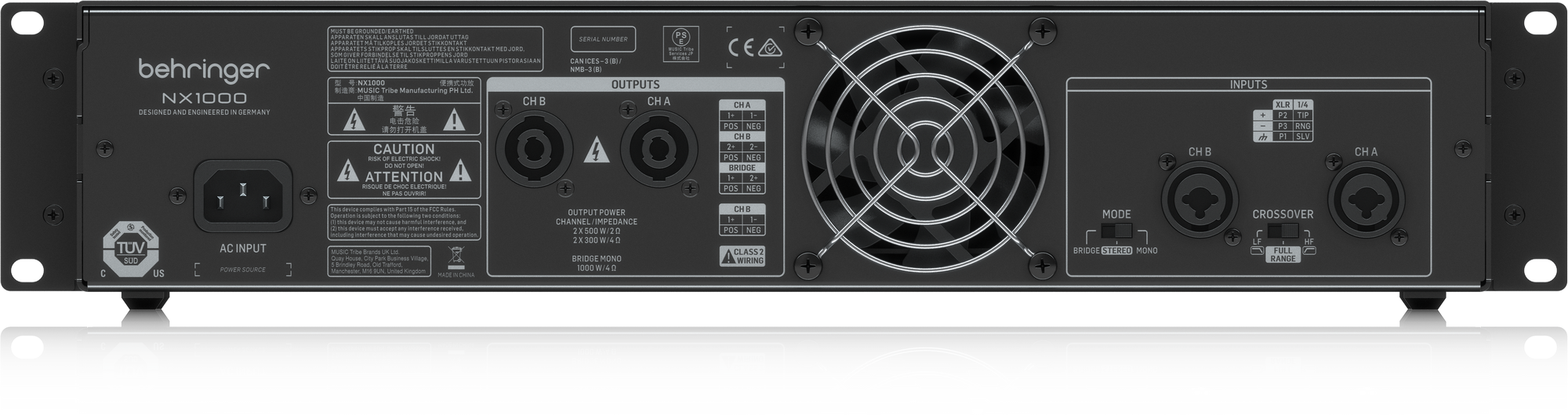 Behringer NX1000 имеет огромную мощность, при этом обладает лёгким весом, что делает устройство подходящим решением для концертных и студийных условий. Усилитель практически не имеет собственного шума, без потерь пропускает через себя входящий сигнал, а также страхует от перегрузки за счёт встроенных лимитеров и имеет защиту от перегрева. Усилитель потребляет малую мощность 150 Вт.