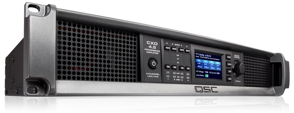 QSC CXD4.5 несет на борту массу современных технологий для лучшей работы многоканальных систем. Технология FAST (Flexible Amplifier Summing Technology) распределяет суммарную мощность между одним, двумя, тремя или четырьмя каналами, за счет чего достигается оптимальная производительность. Встроенный DSP-процессор предлагает большой набор функций: кроссовер, фильтры параметрического эквалайзера, дилэи и лимитеры; всё это устраняет необходимость во внешних акустических процессорах. Есть 20 заводских пресетов настроек с возможностью редактирования и сохранения в 50 ячеек. Встроенная система помощи упрощает настройку усилителя, позволяя выбрать необходимую конфигурацию из списка самых популярных пассивных громкоговорителей.