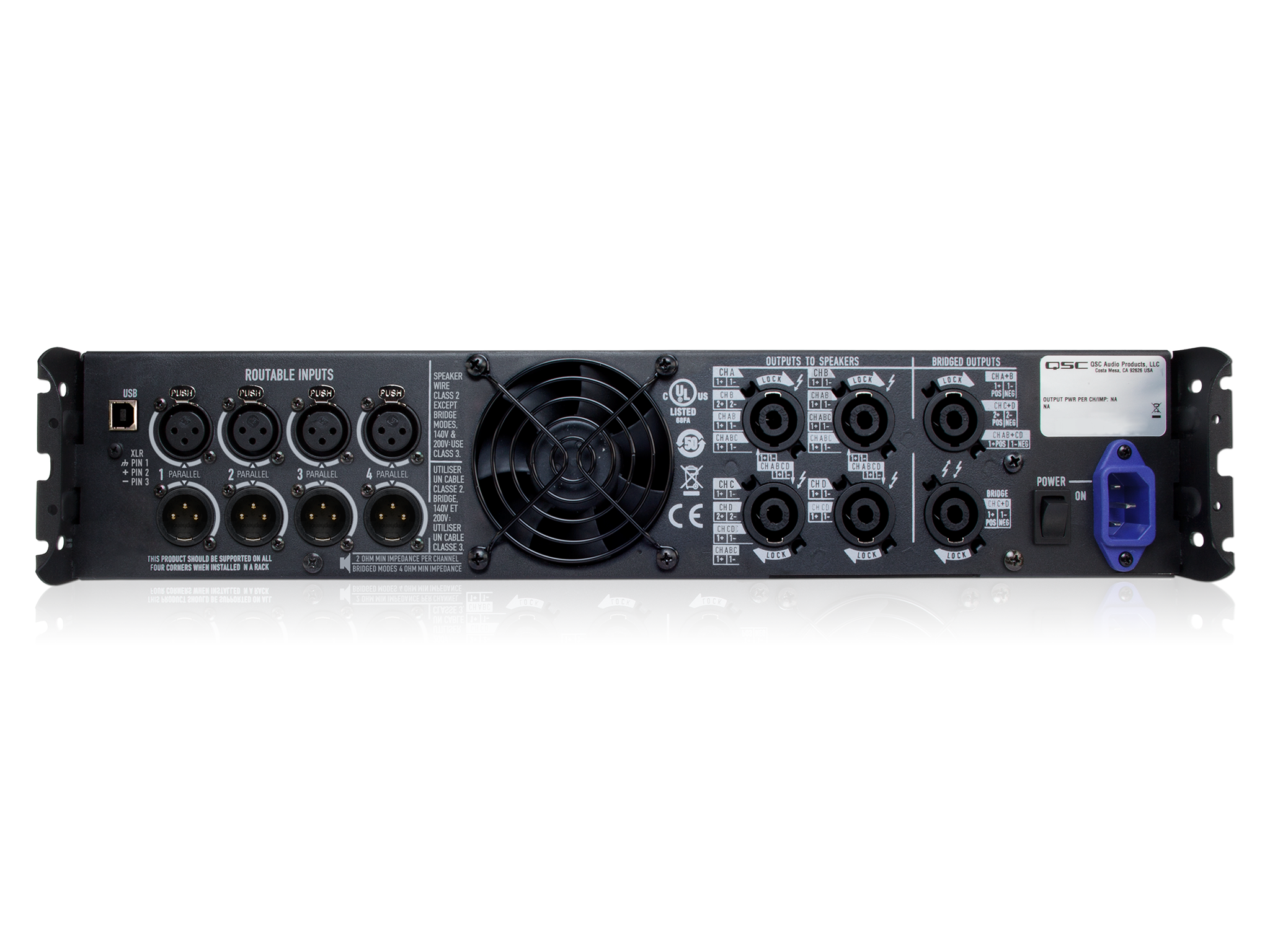 На тыловой панели QSC PLD4.2, помимо вентилятора, прикрытого защитной решеткой, располагаются входные разъемы на XLR-F и XLR-M, которые позволят подсоединять разнообразные источники, и выходные разъемы на Neutrik NL Speakon, отдельные для каждого канала и для мостового режима. Рядом находится тумблер питания, управляющий общей подачей тока. Наконец, на тыловой панели находится USB-разъем, предназначенный для подключения к компьютеру, обновления прошивки и управления конфигурацией усилителя в фирменном ПО Amplifier Navigator.
