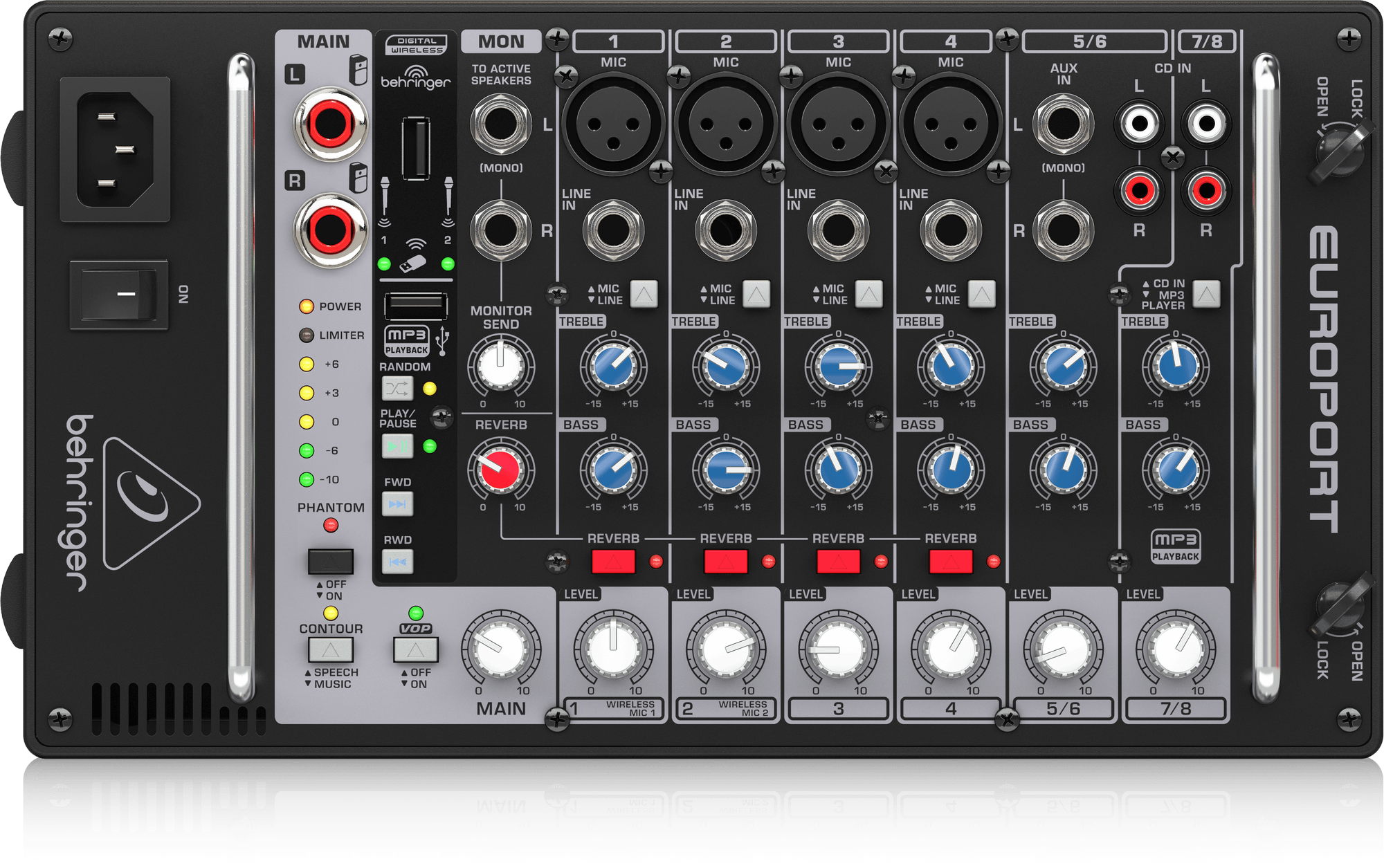 Каналы 1-4 характеризуются высококачественными XENYX микрофонными предусилителями, которые предоставляют действительно чистый входной сигнал без нежелательного приукрашивания или искажений. Также предусмотрено +48В фантомного питания, и теперь Вы можете использовать студийного класса конденсаторные микрофоны. Каждый входной канал имеет высоко музыкальный 2-полосный эквалайзер. Система оптимизирована для более легкого использования, остается только щелкнуть переключателем Music/Speech для выбора надлежащей балансировки. Система также включает назначаемую пользователем Voice-Over-Priority функцию, которая автоматически приглушает стерео каналы, когда используется микрофон и теперь все ваши важные сообщения будут услышаны.
