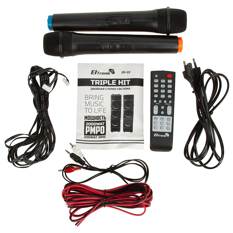 Комплект: Акустическаясистема (2шт), Микрофон безпроводной 2 ш, Пульт Д/У, Кабель питания, Кабель синхронизации подсветки, Кабель акустический, Кабель 3.5 мм на тюльпан, Инструкция