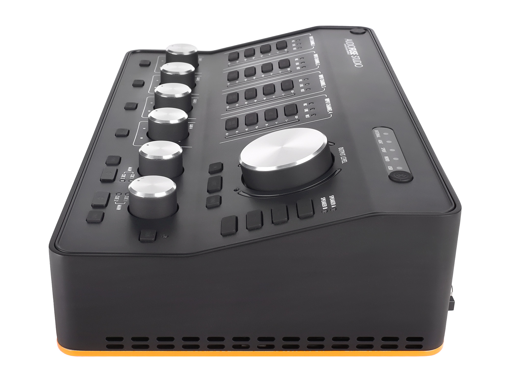 На лицевой панели звуковой карты располагаются регуляторы и индикаторы уровня громкости, кнопки для инверсии фазы для каналов 1-4, клавиши Dim, Mute и Mono для общих выходов, а также клавиша для активации встроенного Talkback-микрофона для переговоров. Также присутствует индивидуальное фантомное питание +48 В для первых четырех каналов. Еще одной интересной особенностью является возможность передачи аудио различным устройствам по Bluetooth с поддержкой кодеков aptX и AAC.