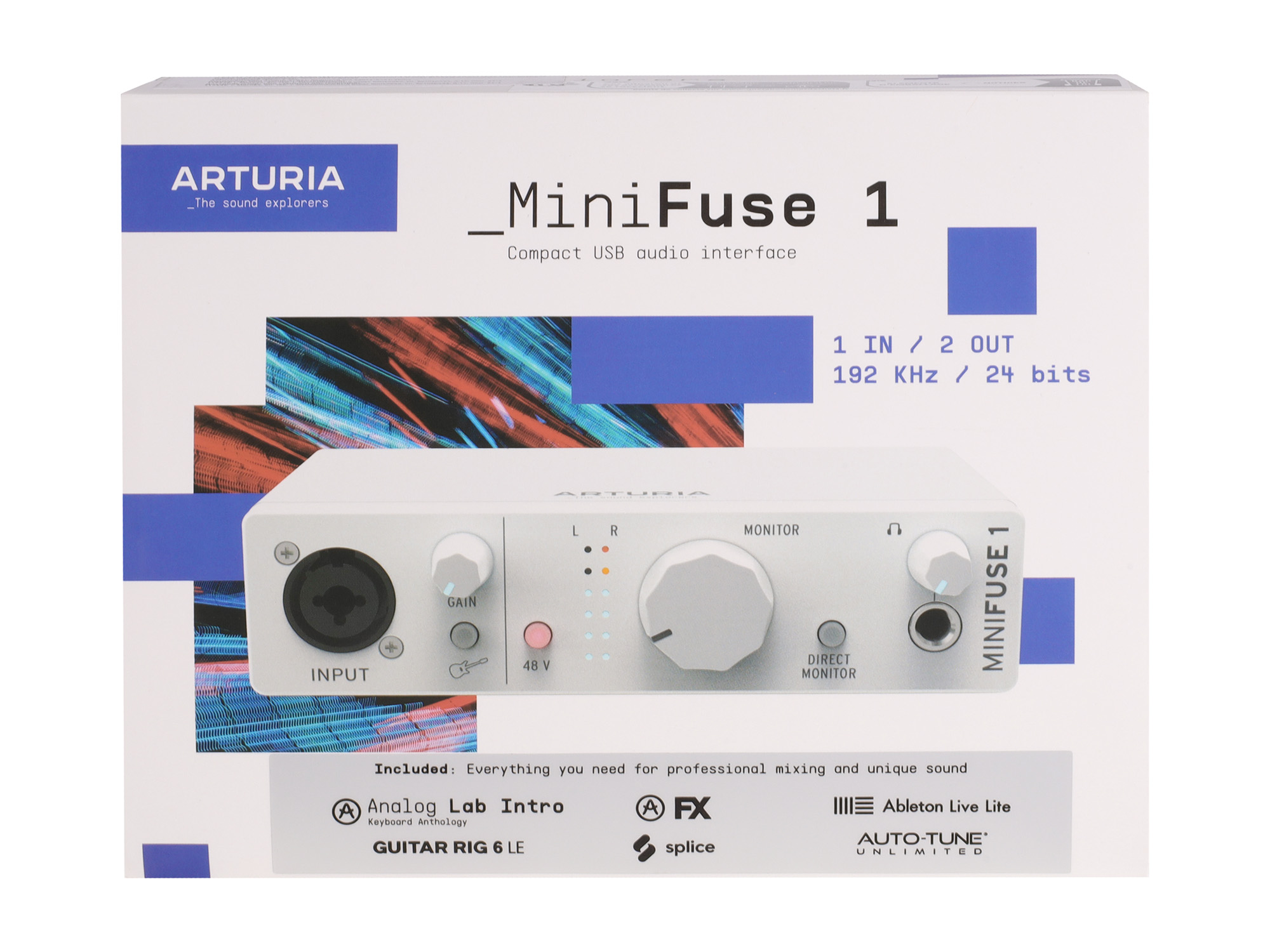 Аксессуары в комплекте: кабель USB-A to USB-C, лицензионные ключи для плагинов Pre 1973, Rev PLATE-140, Delay TAPE-201, Chorus JUN-6 и Analog Lab Intro, программ Ableton Live Lite и NI Guitar Rig 6 LE, 3-месячная бесплатная подписка на сервисы Splice и Auto-Tune Unlimited